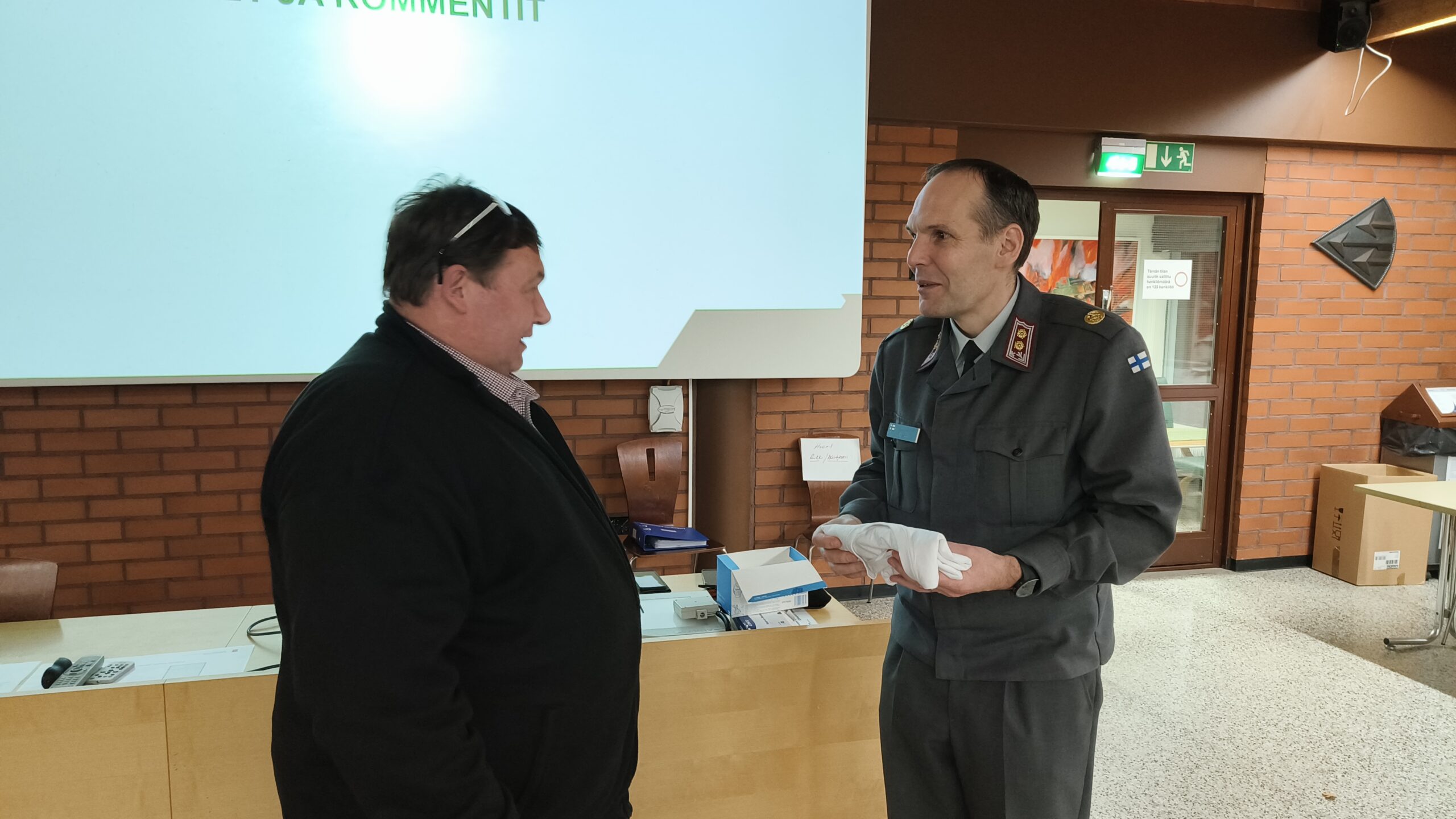 Piirin puheenjohtaja Jari Hirvimäki luovutti pienen muistolahjan evl Alesmaalle