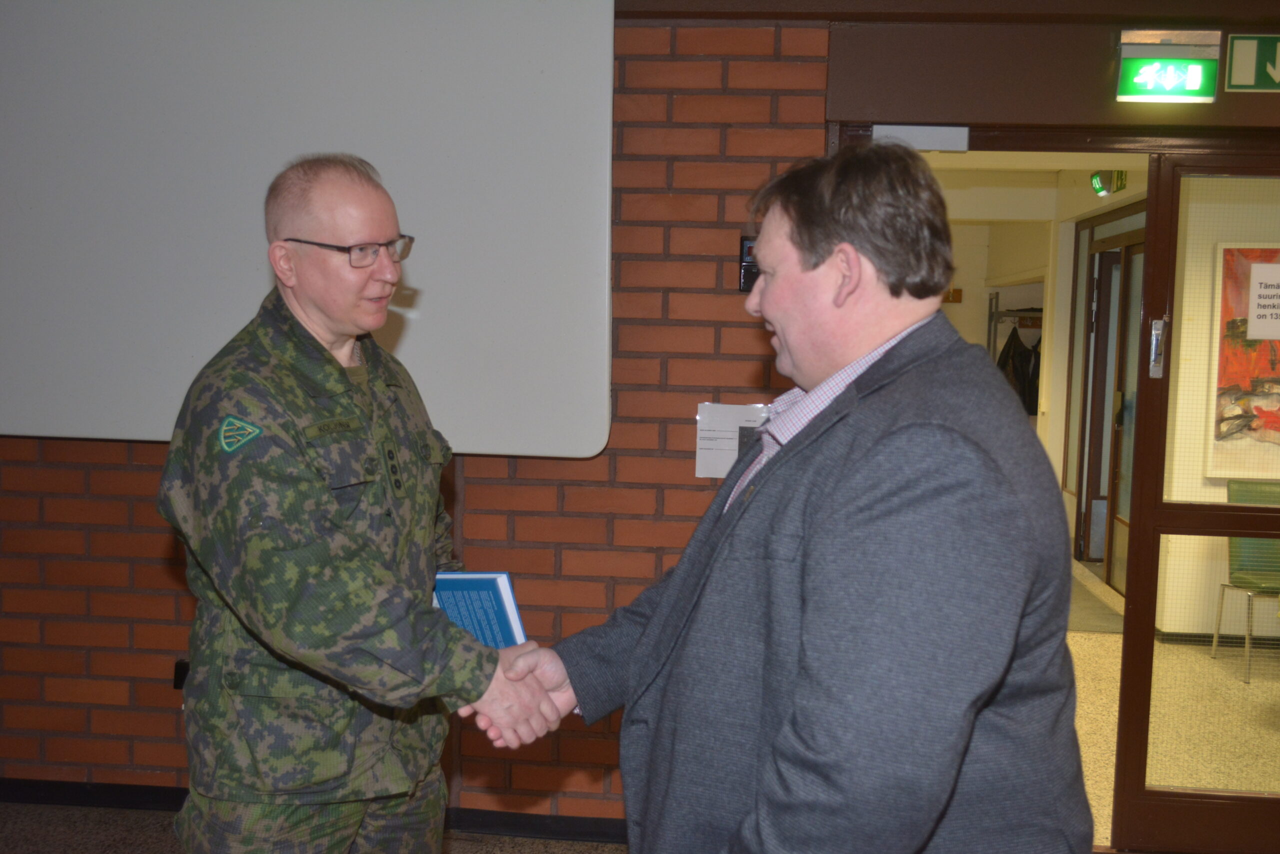 Eversti Tero Koljonen vastaanottaa pienen kiitoslahjan piirin puheenjohtaja Jari Hirvimäeltä
